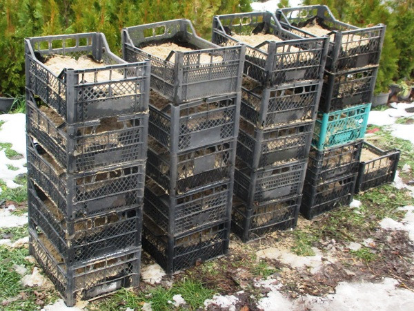 Гарно підготувався до майбутньої зимньої прививки. В прикопі чекають на цю подію майже всі, з запланованого, при щепи. Та не стабільна погода зимова мене турбує. А чи не вмерзнуть ті підщепи в лід. Й розмерзнуться мені потім, десь так в середині травня, будучи засипаними мною ще й гарненько тирсою. Тож почав потихенько переміщати прищепи з прикопу в сховище. Й там в ящиках засипати їхнє коріння вологим піском. Й знову. Спина мені в першому підході дала зробити лише 2 ходки з прикопу в сховище. Й потім ще раз сходив до прикопу, набрав гарний оберемок підщеп. Й закопав їх на зберігання в сховищі. Не ризикуватиму.